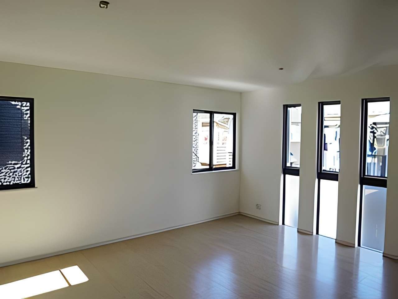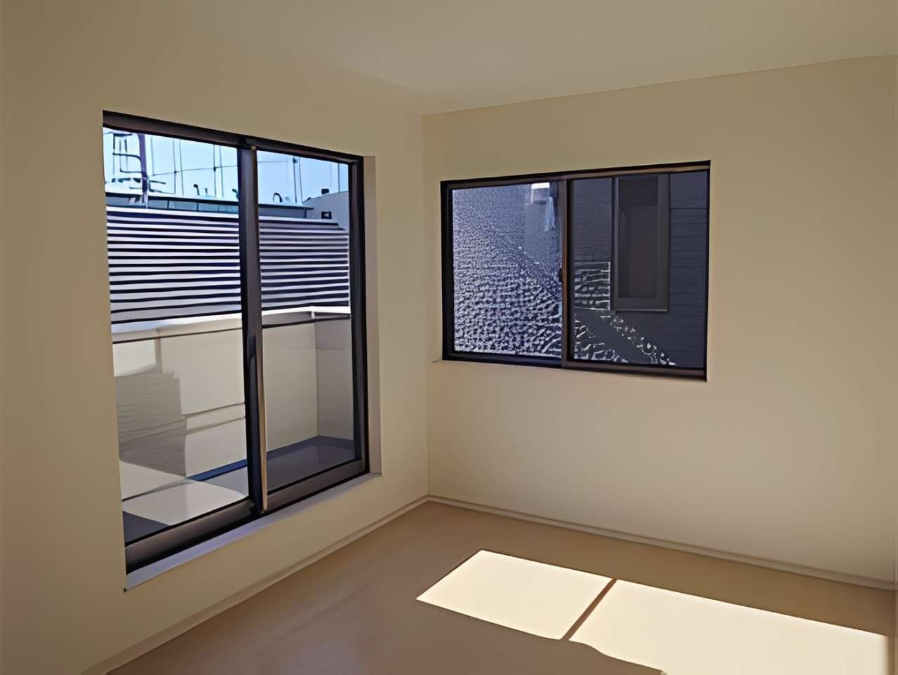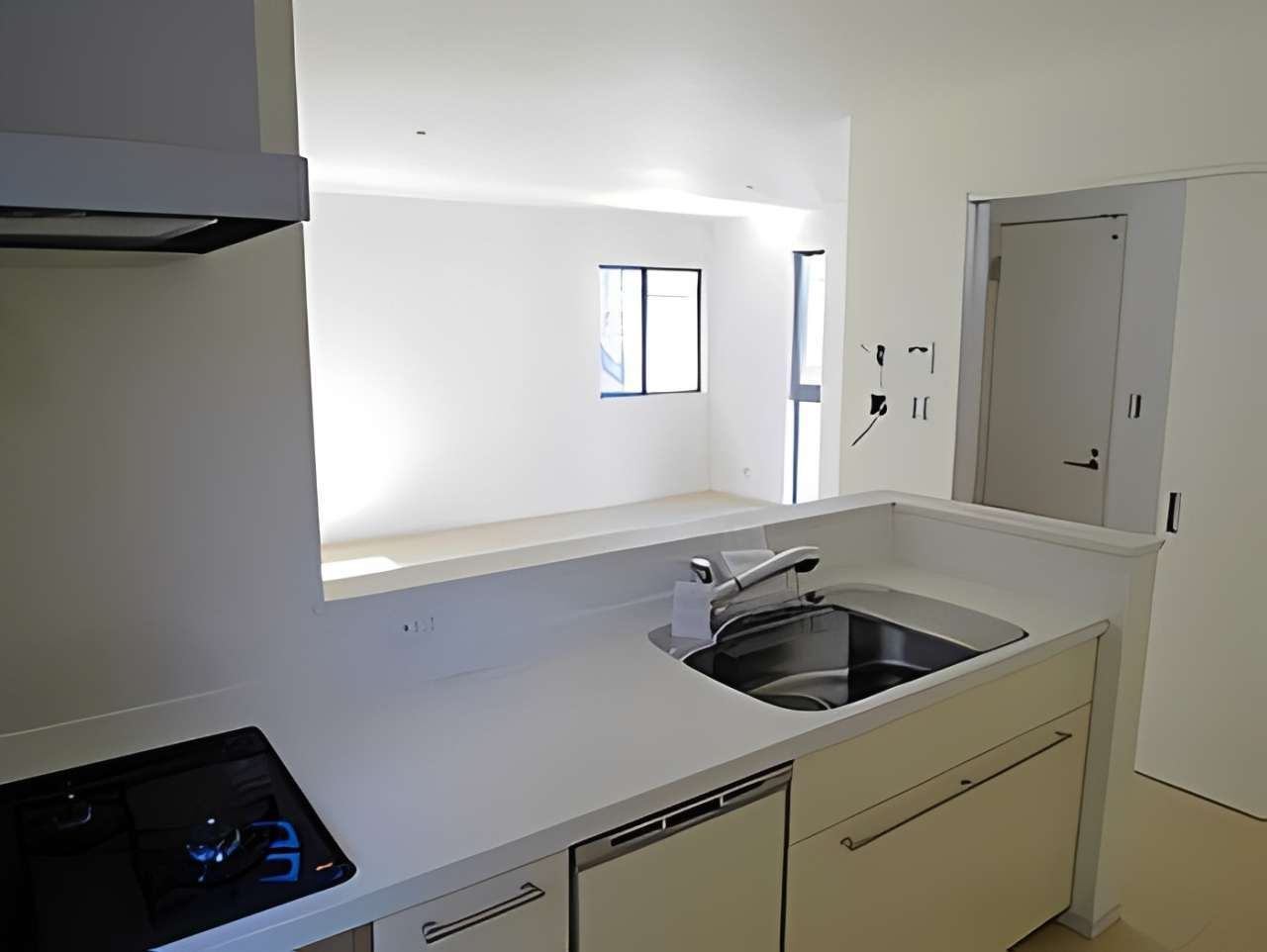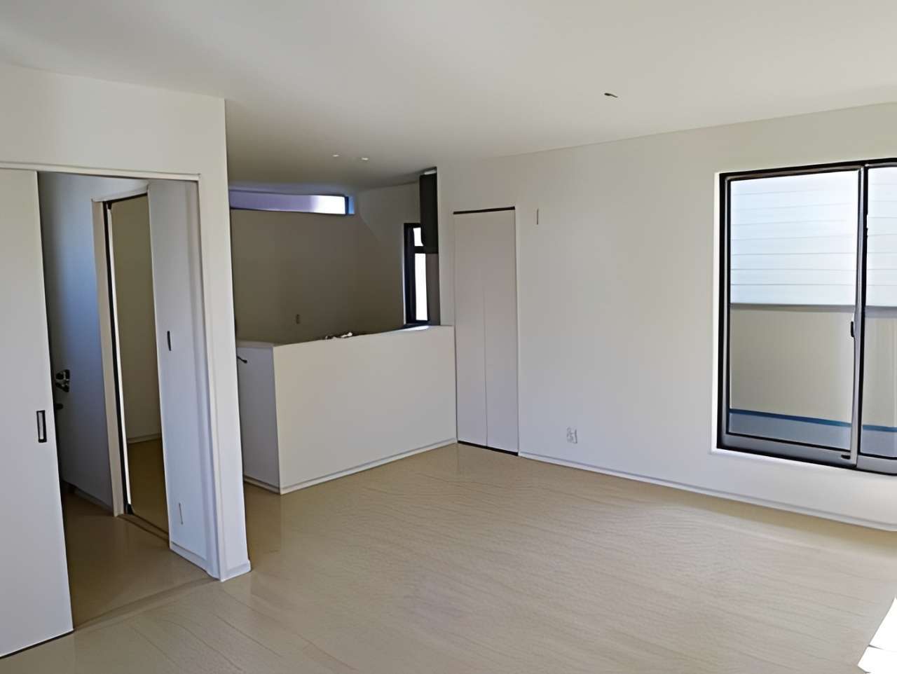 室内は、白を基調とした明るいLDKにスリット窓を配置し、採光とプライバシー確保を両立。対面式キッチンからはリビング全体が見渡せ、家族の会話が弾む設計です。