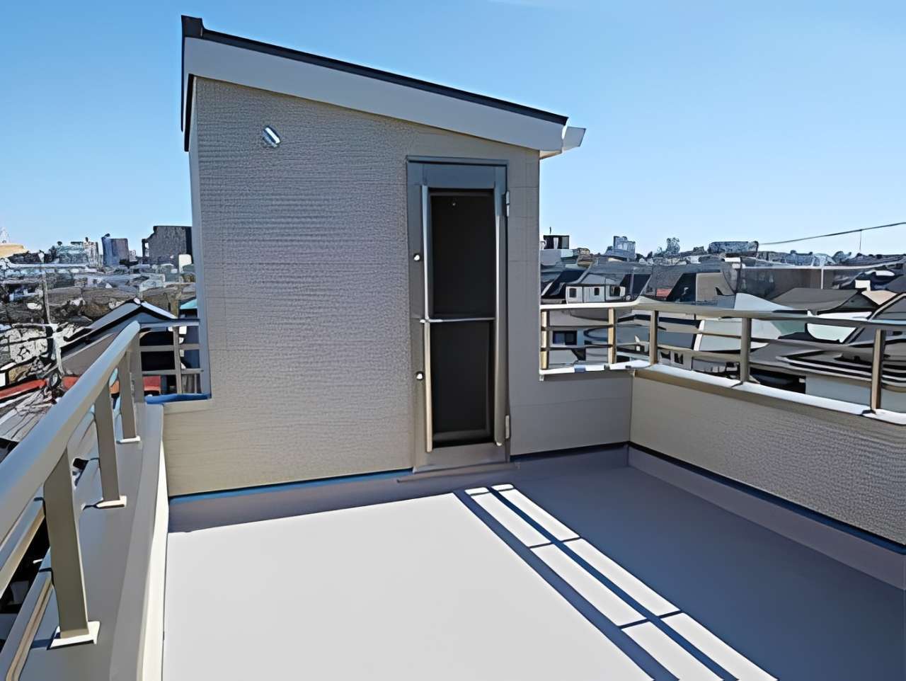 最大の特長は、都市部での暮らしに便利なビルトインガレージ(車庫)と、開放感あふれる屋上ペントハウス(スカイバルコニー)。周囲の視線を気にせず、プライベートな外遊びやリラックスタイムを楽しめる屋上空間は、J様邸の象徴的なスポットとなりました。