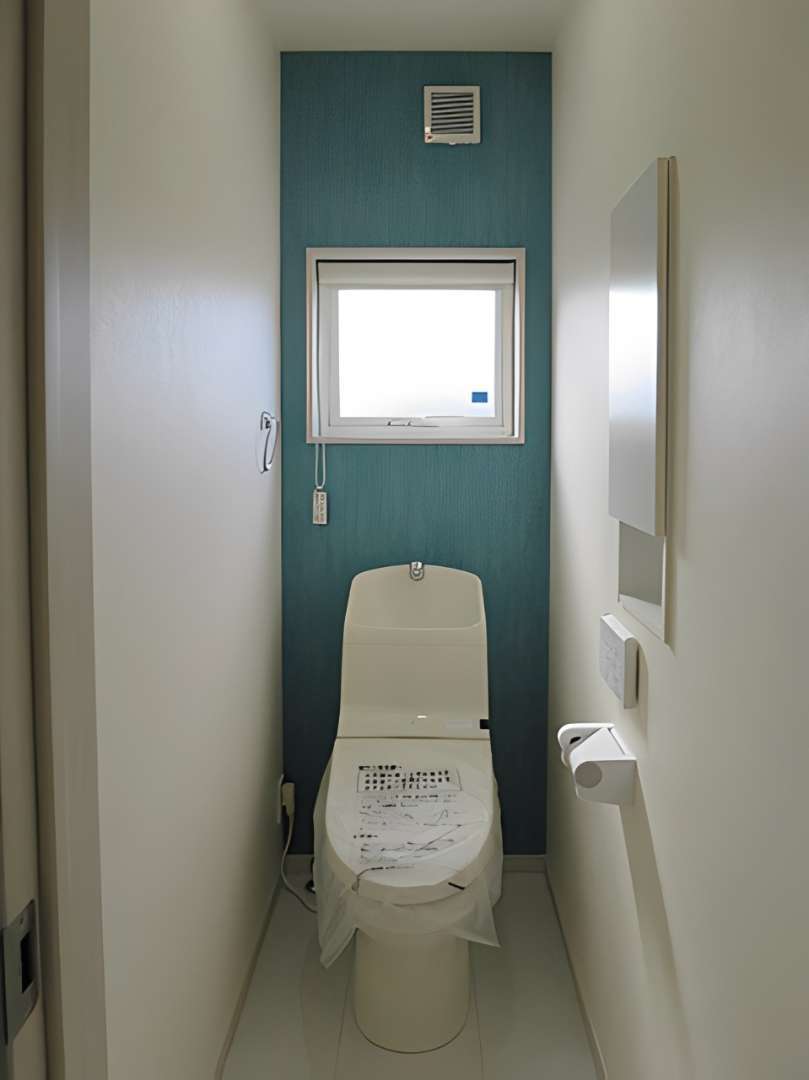 鮮やかなブルーグリーンのアクセントクロスが目を引くトイレです。高い位置に窓を設けることで、外からの視線を遮りプライバシーを守りながらも、しっかりと自然光を取り入れられる設計にしています。