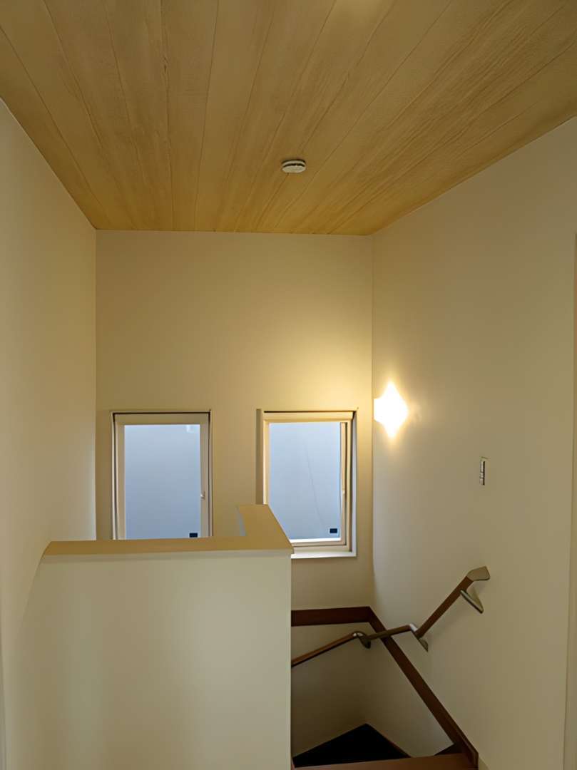 階段ホールにもLDKと同じ木目調の天井を採用し、家全体で統一感のあるデザインに仕上げました。2つのスリット窓と温かみのあるブラケットライトが、足元を優しく照らしてくれます。