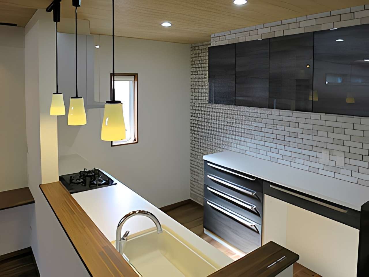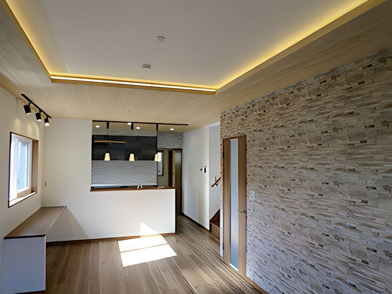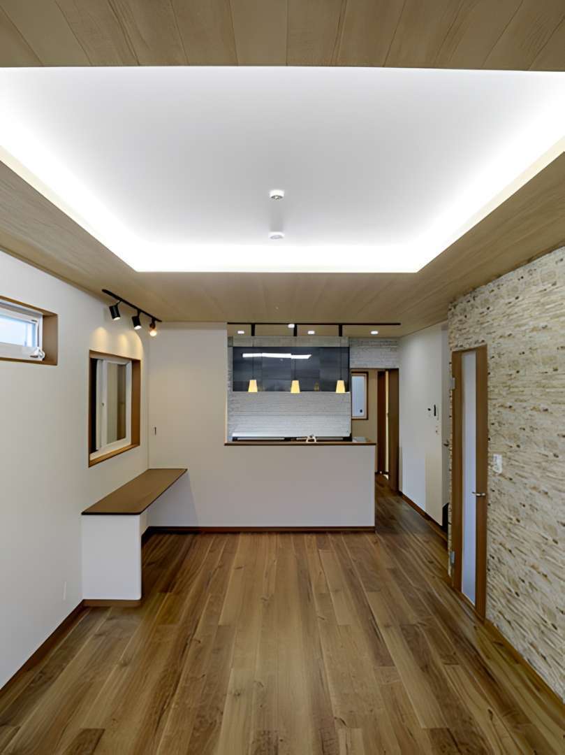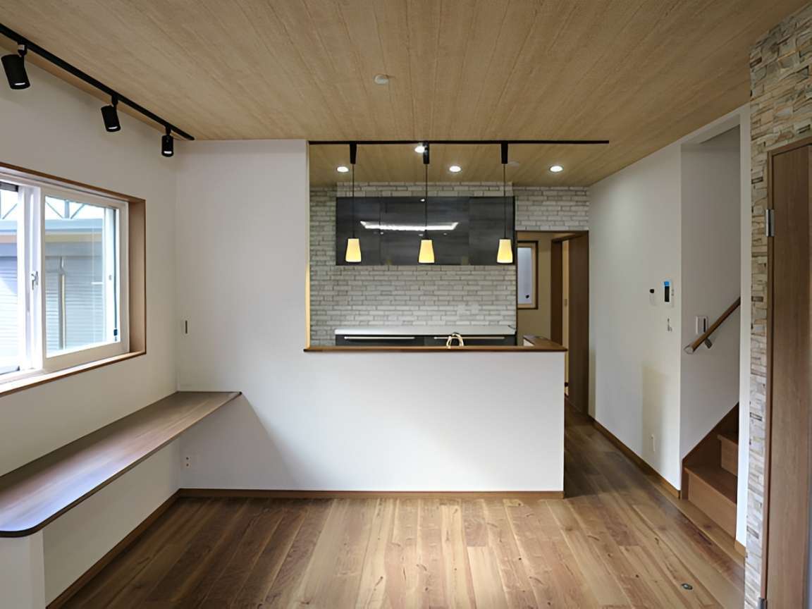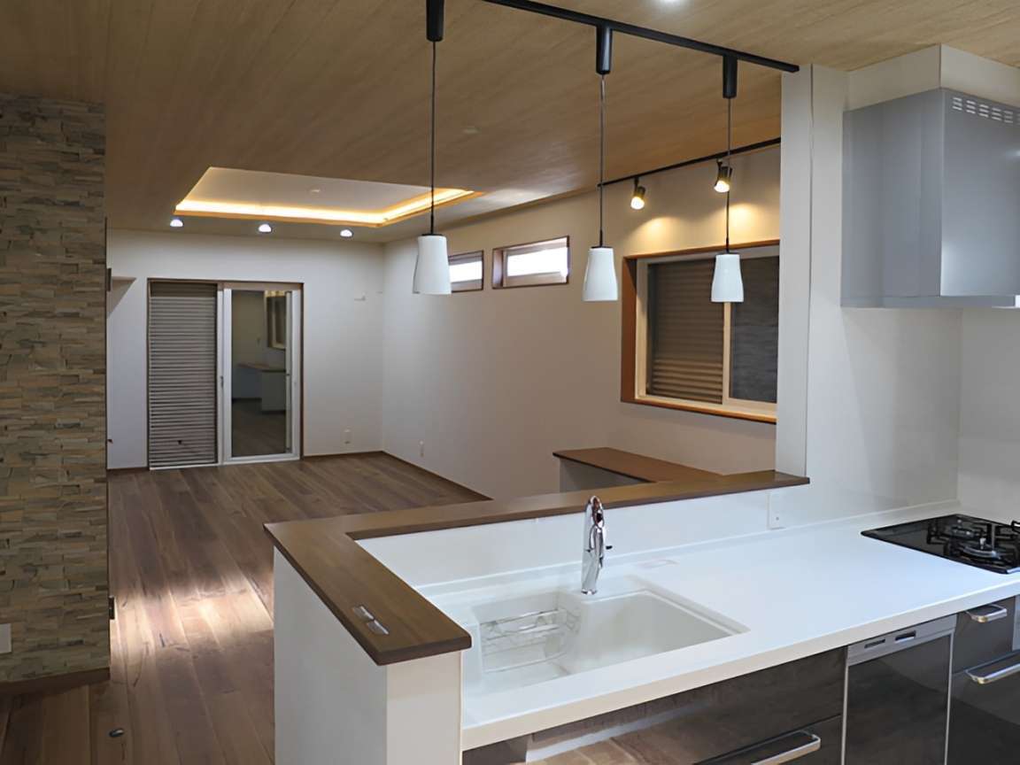 外観は白とブラウンのツートンカラーでモダンな仕上がりに。室内に入ると、木目調の天井と温かみのあるフローリングが広がる、開放的なLDKが目を引きます。石目調のアクセントウォールや間接照明、ペンダントライトを採用し、デザイン性の高い空間を実現しました。