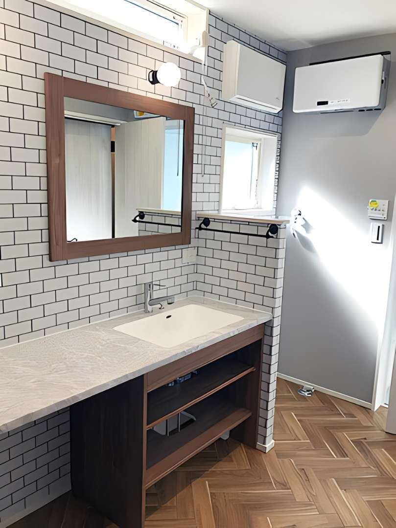 ワイドな天板が特徴の洗面台。キッチンとお揃いのサブウェイタイルをあしらい、統一感のある住まいに。ヘリンボーンの床材がアクセントを添える、ホテルライクな仕上がりです。