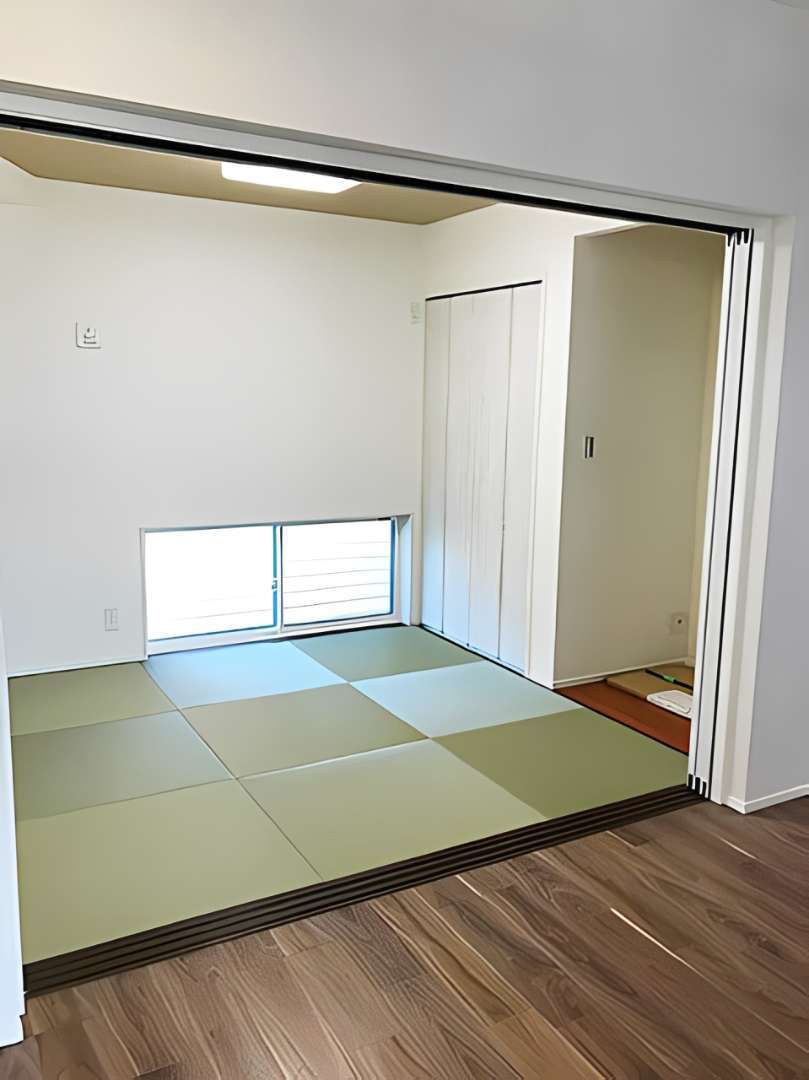 リビングに隣接する和室は、縁なしのスクエア畳(琉球畳風)でモダンな印象に。足元の地窓から柔らかな光を取り込み、お昼寝やゲストルームとして心地よく過ごせる設計です。