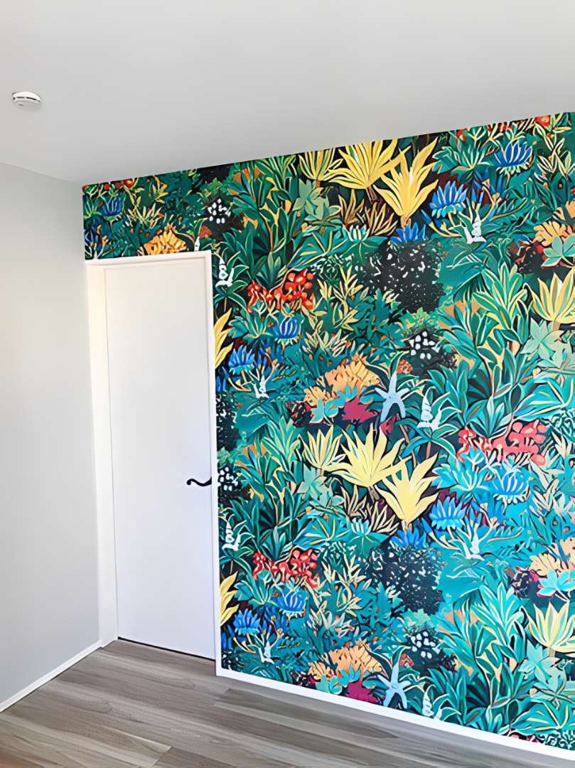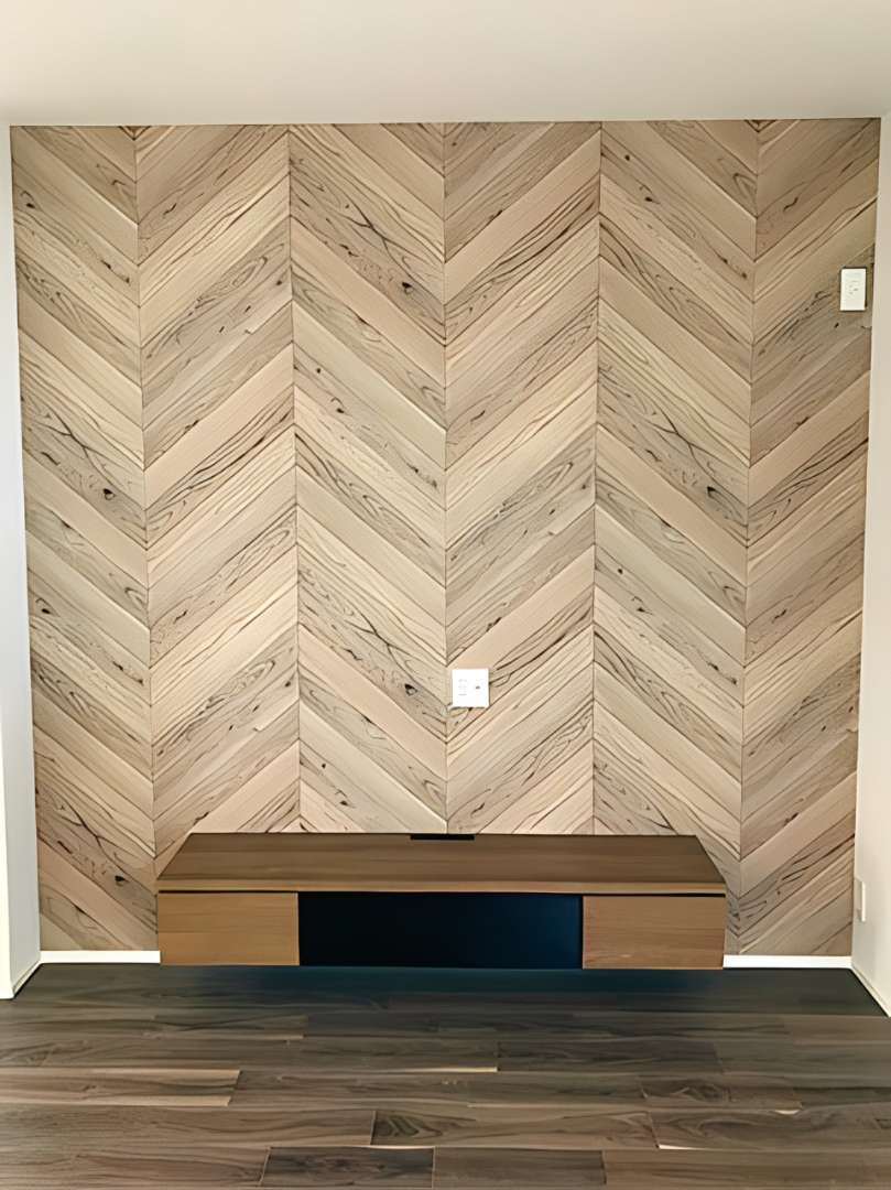 リビング・和室: テレビ背面には温かみのあるヘリンボーンの壁材を採用。隣接する和室は、モダンな縁なし畳と地窓から差し込む光が心地よい、安らぎの空間となっています。