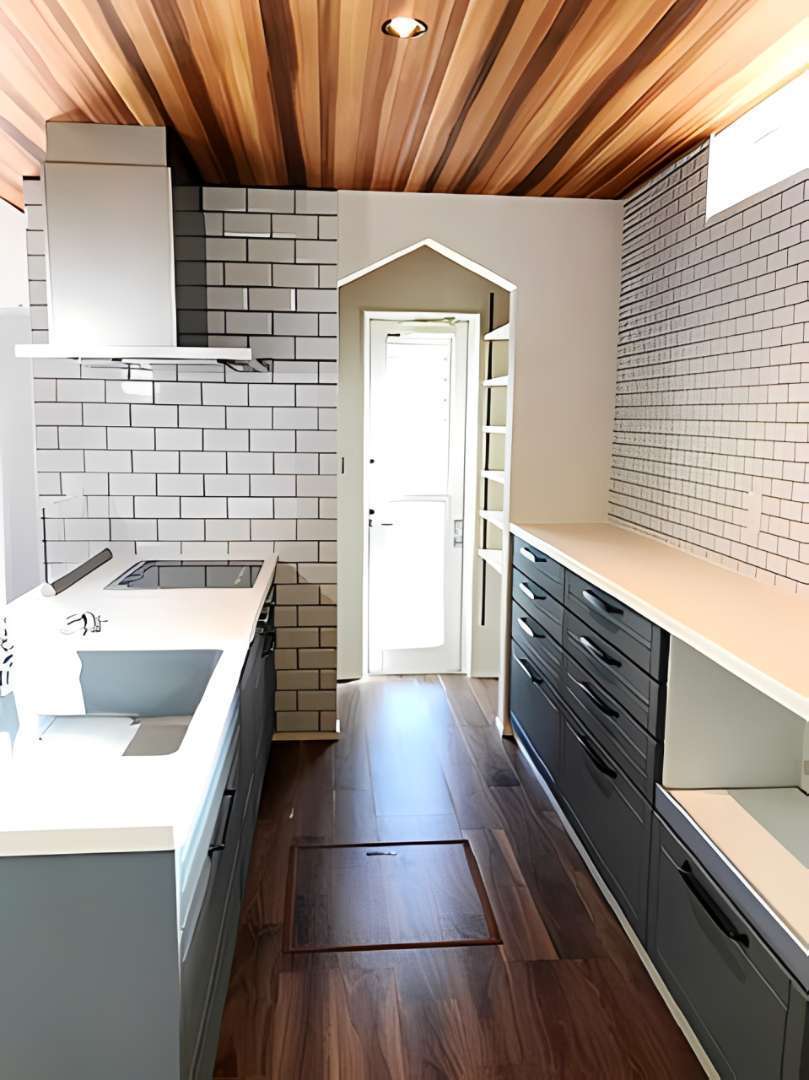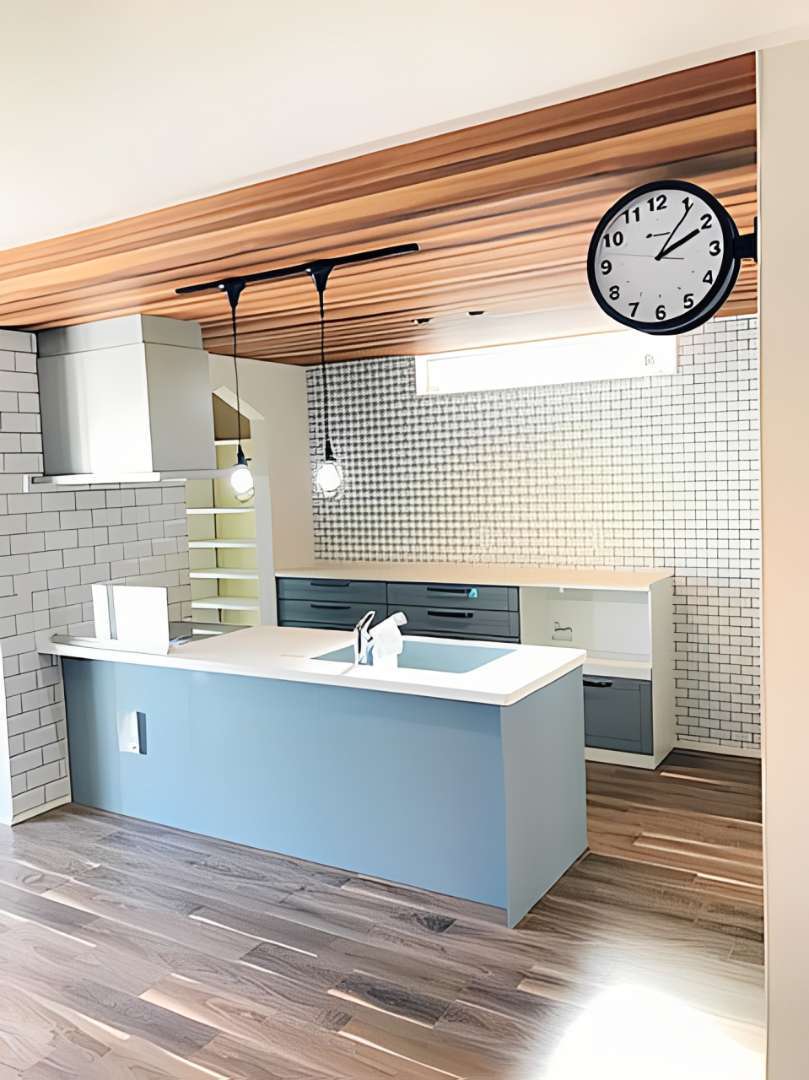 キッチン・水回り: サブウェイタイル風の壁面が目を引くキッチンは、ブルーのカウンターがアクセント。収納力抜群のパントリーや、造作風の広々とした洗面台など、家事動線とデザインを徹底的に追求しました。