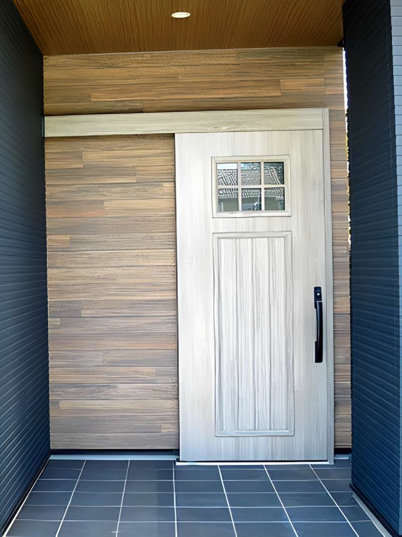 外観は深みのあるネイビーを基調とし、軒天や壁面にウッドを組み合わせた都会的なデザインです。雨の日でも安心な屋根付きウッドデッキを設置し、家族でアウトドア気分を楽しめる開放的な空間を演出しました。