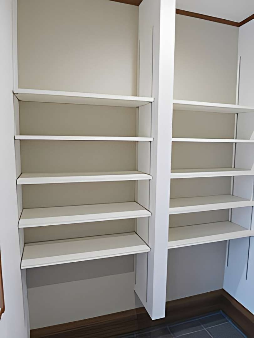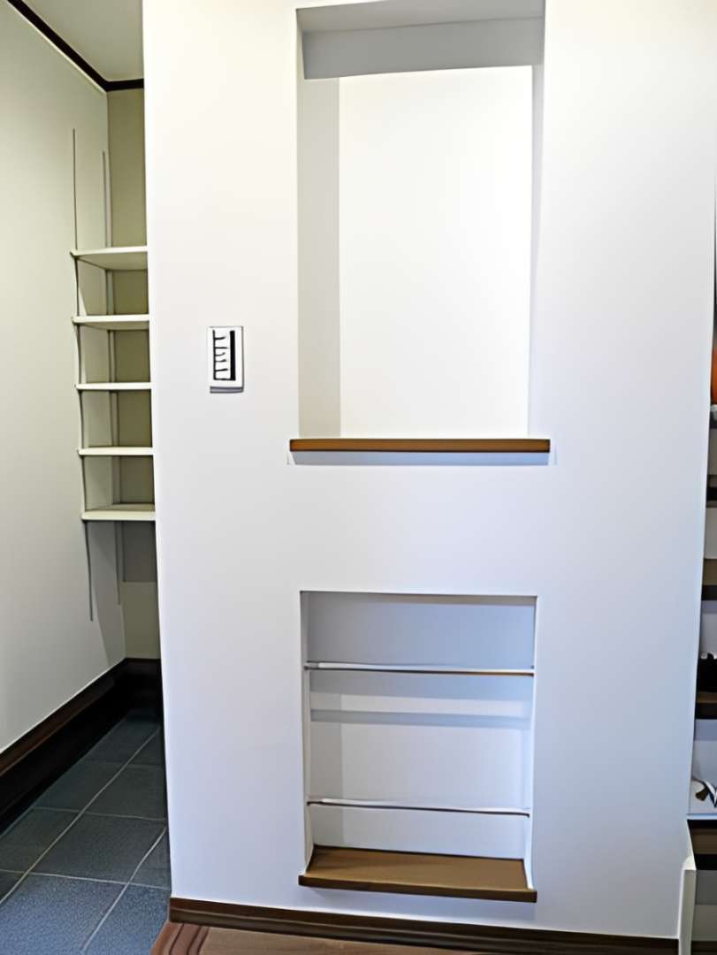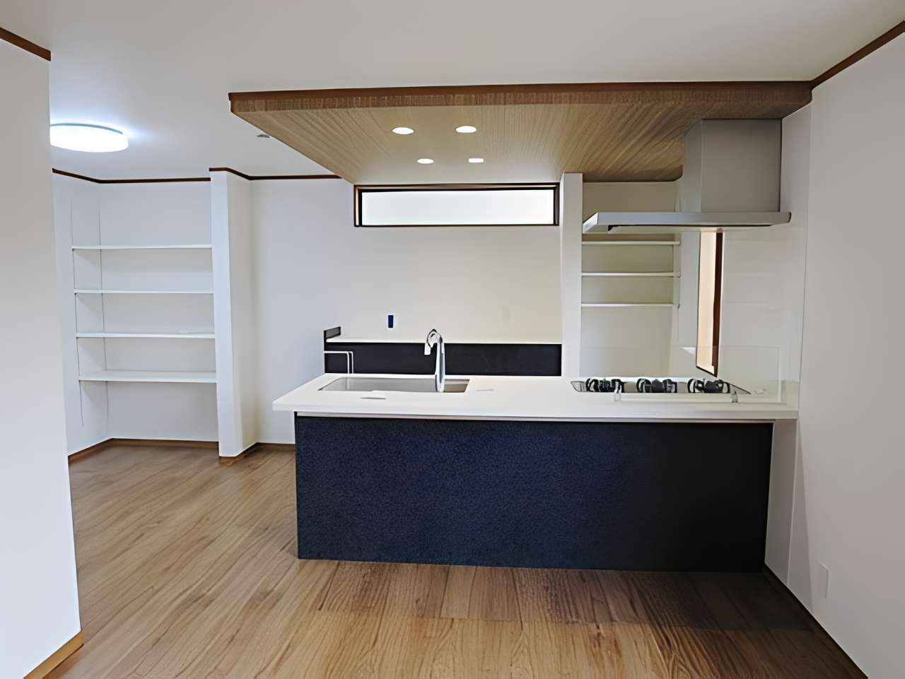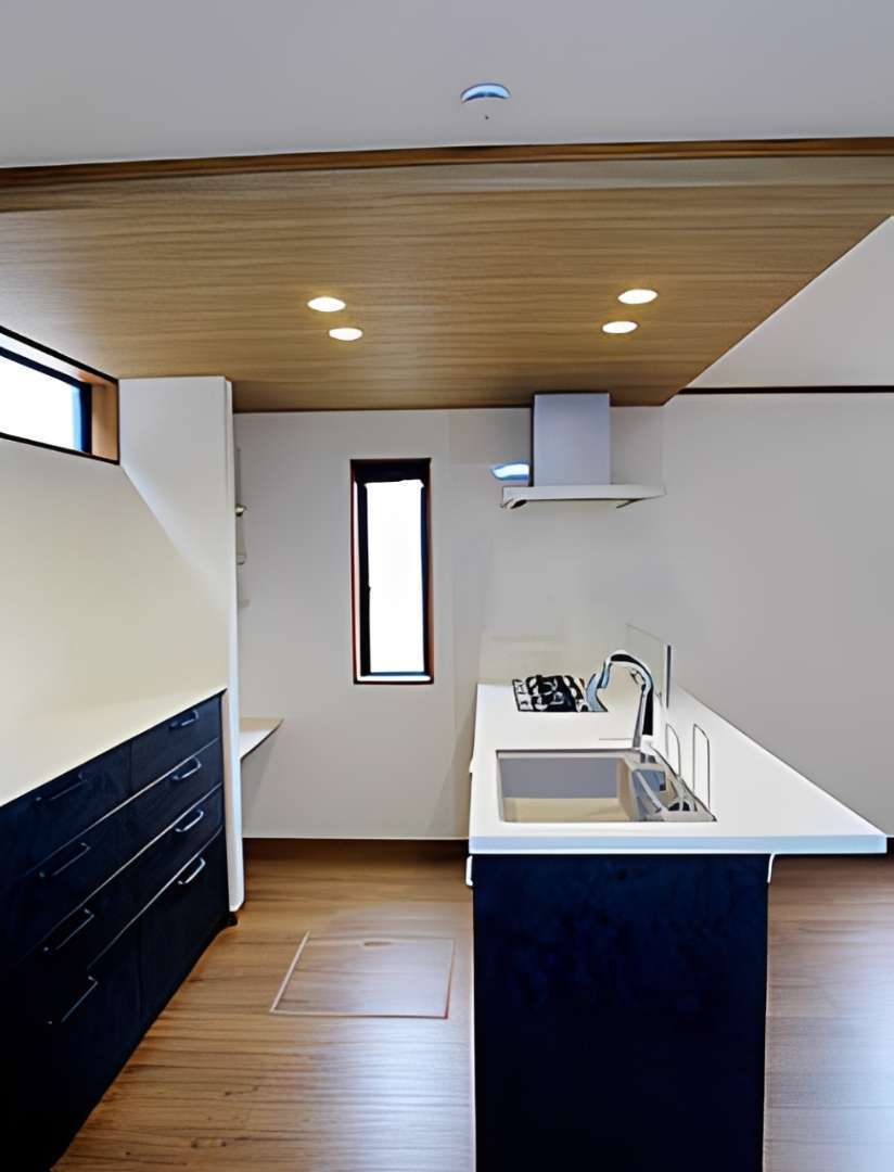内装は機能美を追求。対面キッチンには、木目調の下がり天井と間接照明を採用し、まるでおしゃれなカフェのような雰囲気に。また、家事動線を考慮した大容量のキッチンパントリーや、玄関周りをスッキリ保つシューズクロークなど、収納計画にも徹底的にこだわっています。