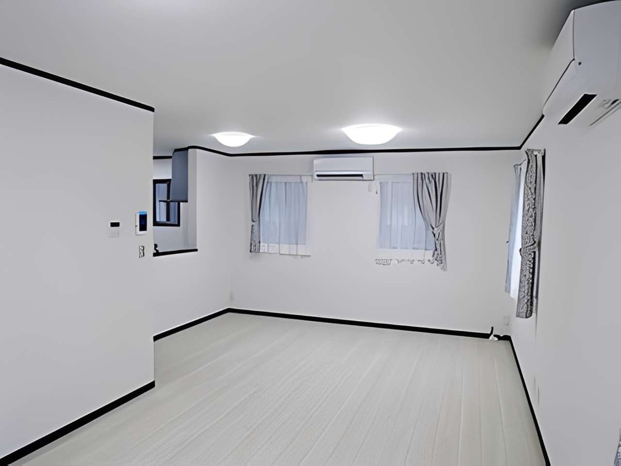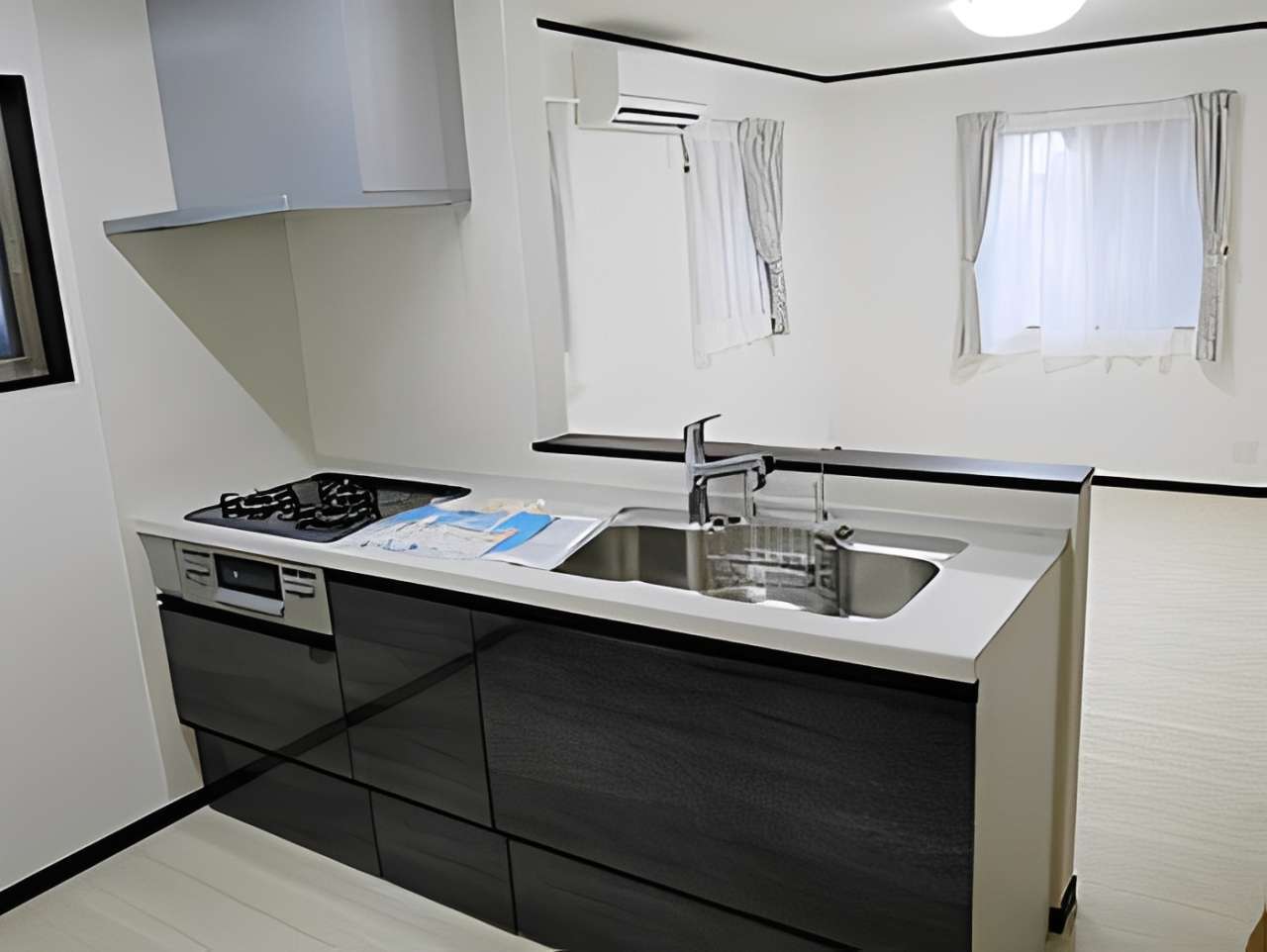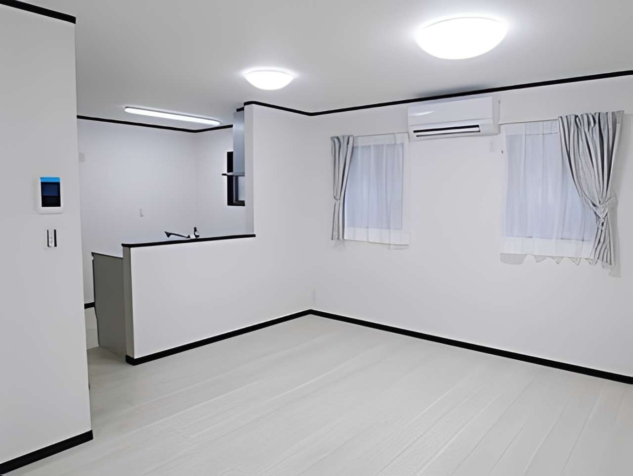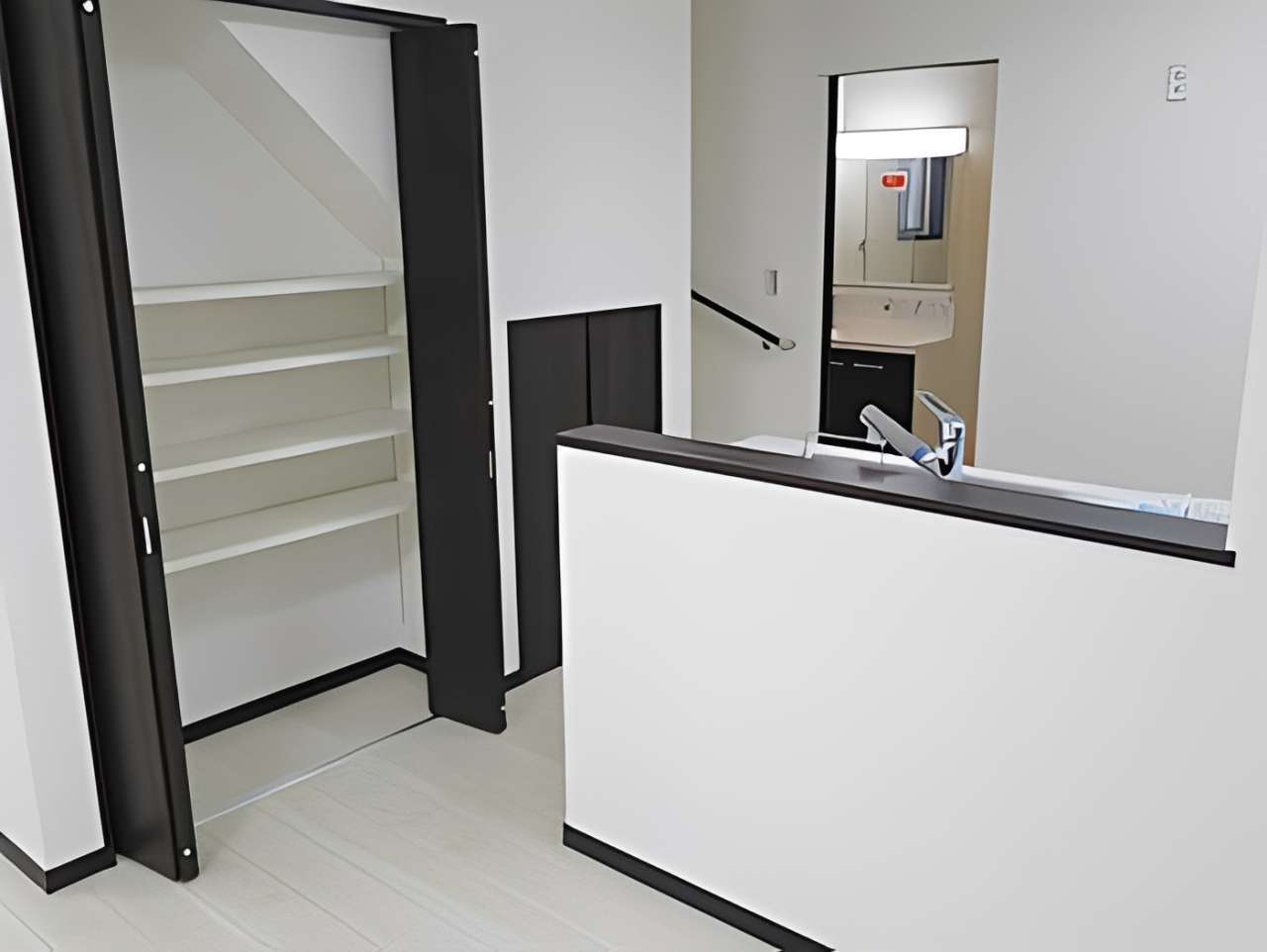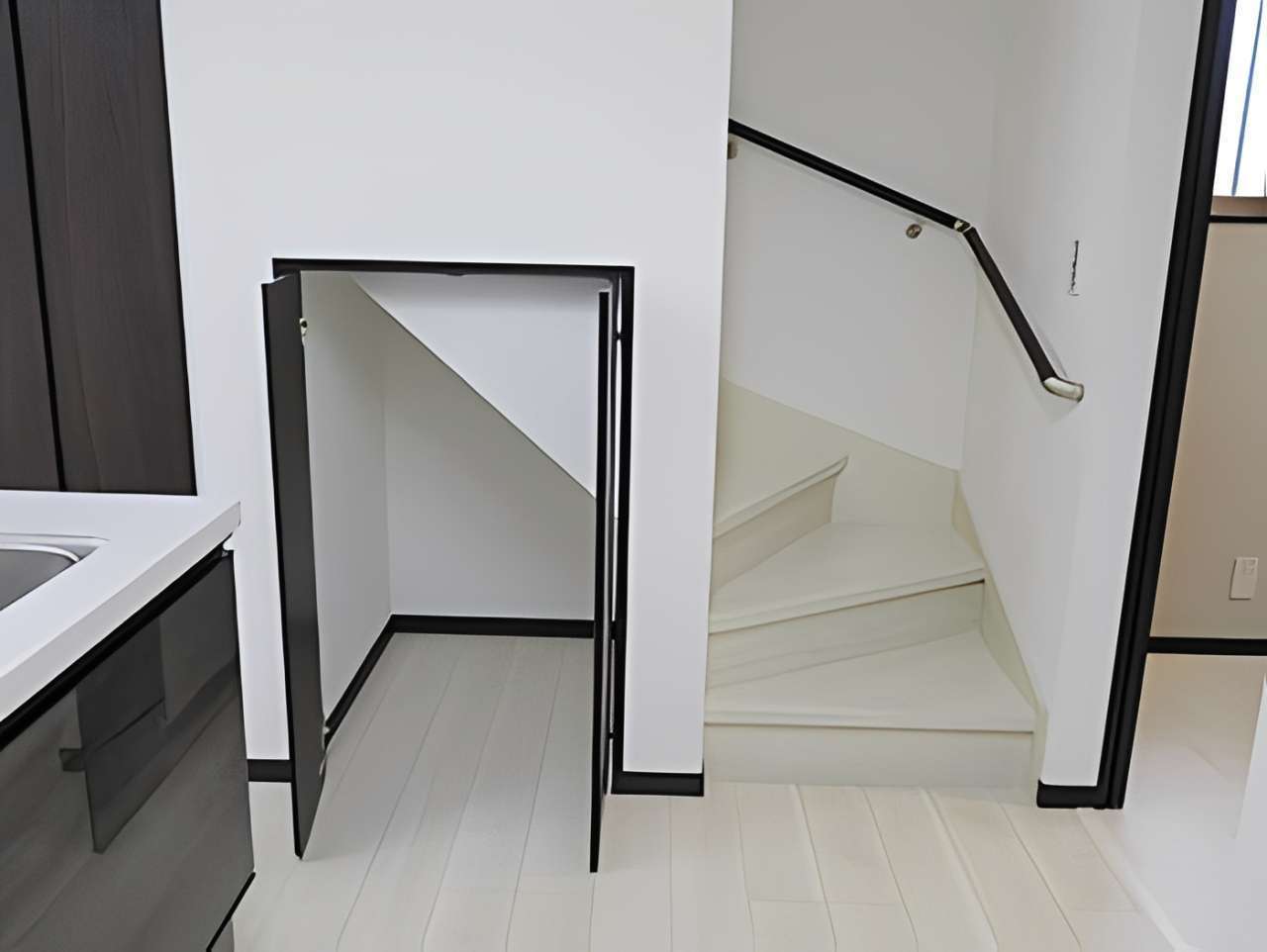 外観は黒と白のコントラストが美しいモノトーンデザイン。内装は白を基調とした開放感あふれるリビングが特徴です。キッチン横には、デッドスペースを有効活用した階段下パントリーを設置。可動棚を採用し、ストック品をスッキリ収納できる家事動線にこだわりました。