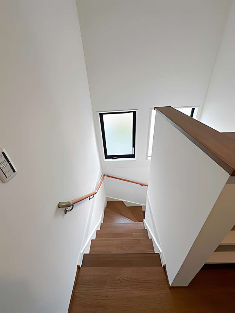 2階へと続く階段スペース。吹き抜け構造と、縦に並べた2つのスリット窓(FIX窓)により、北側でも明るく開放的な空間になりました。木目調の手すりと白い壁のコントラストが爽やかです。