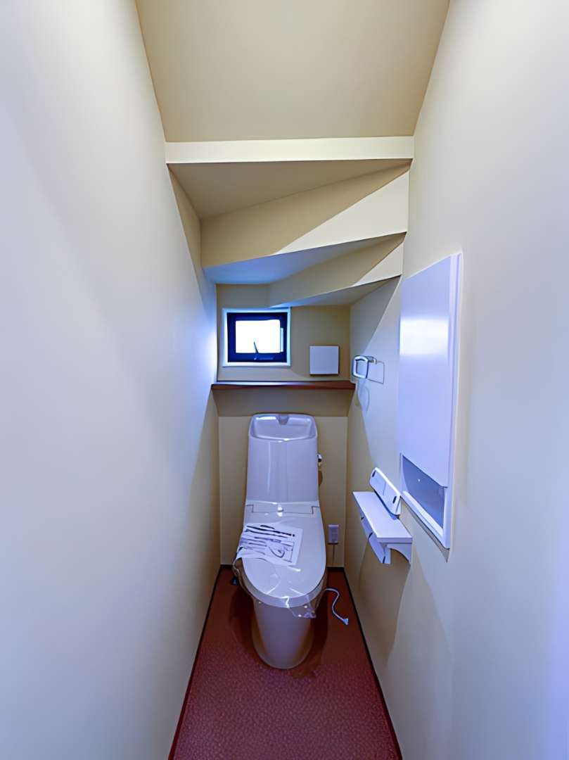 階段下のデッドスペースを有効に活用した、清潔感のあるトイレ。小窓を設けることで採光と通風を確保し、圧迫感を感じさせない工夫を凝らしました。モダンなクッションフロアもポイントです。