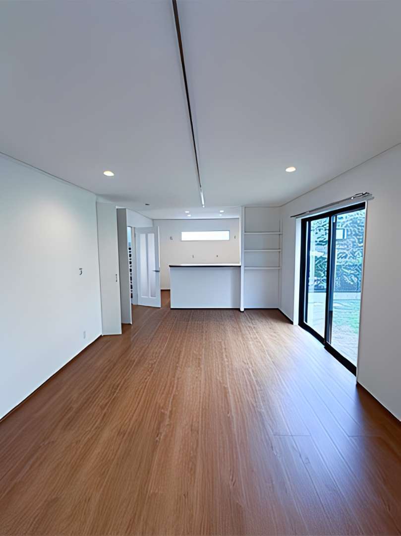 温かみのある木目調フローリングが広がるリビングダイニング。南面に設けた大きな掃き出し窓からは自然光が差し込み、庭への出入りもスムーズです。天井のライティングレールで、照明のレイアウトも自由に楽しめます。