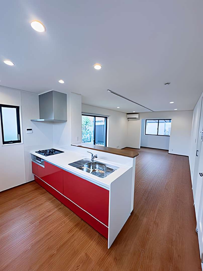 鮮やかなレッドがアクセント。家族と会話が弾む対面式キッチン