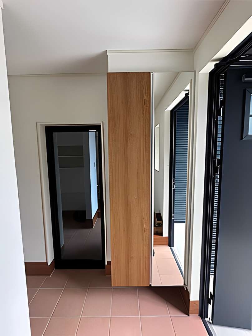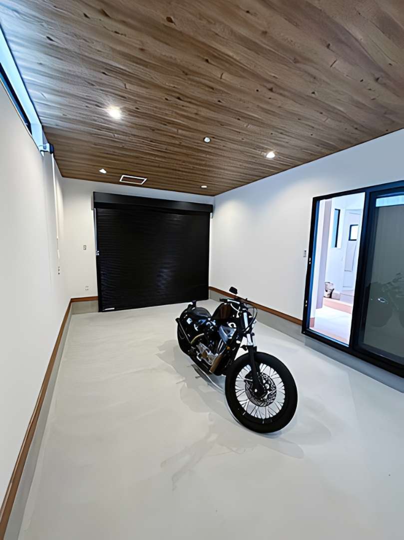 最大の特徴は、家の中にいながら愛車を眺めることができる「バイクガレージ」です。ガレージ内は、木目調の天井と白い壁がスタイリッシュな雰囲気を演出し、愛車が美しく映える空間になりました。また、リビングの窓からもガレージの様子が見える設計になっており、いつでも愛車を感じることができます。