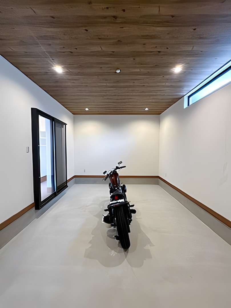 コンクリート打ちっぱなしの床に、温かみのある木目調の天井とダウンライトを組み合わせ、愛車が美しく映える洗練された空間を演出しました。シャッター付きでセキュリティ面も安心です。